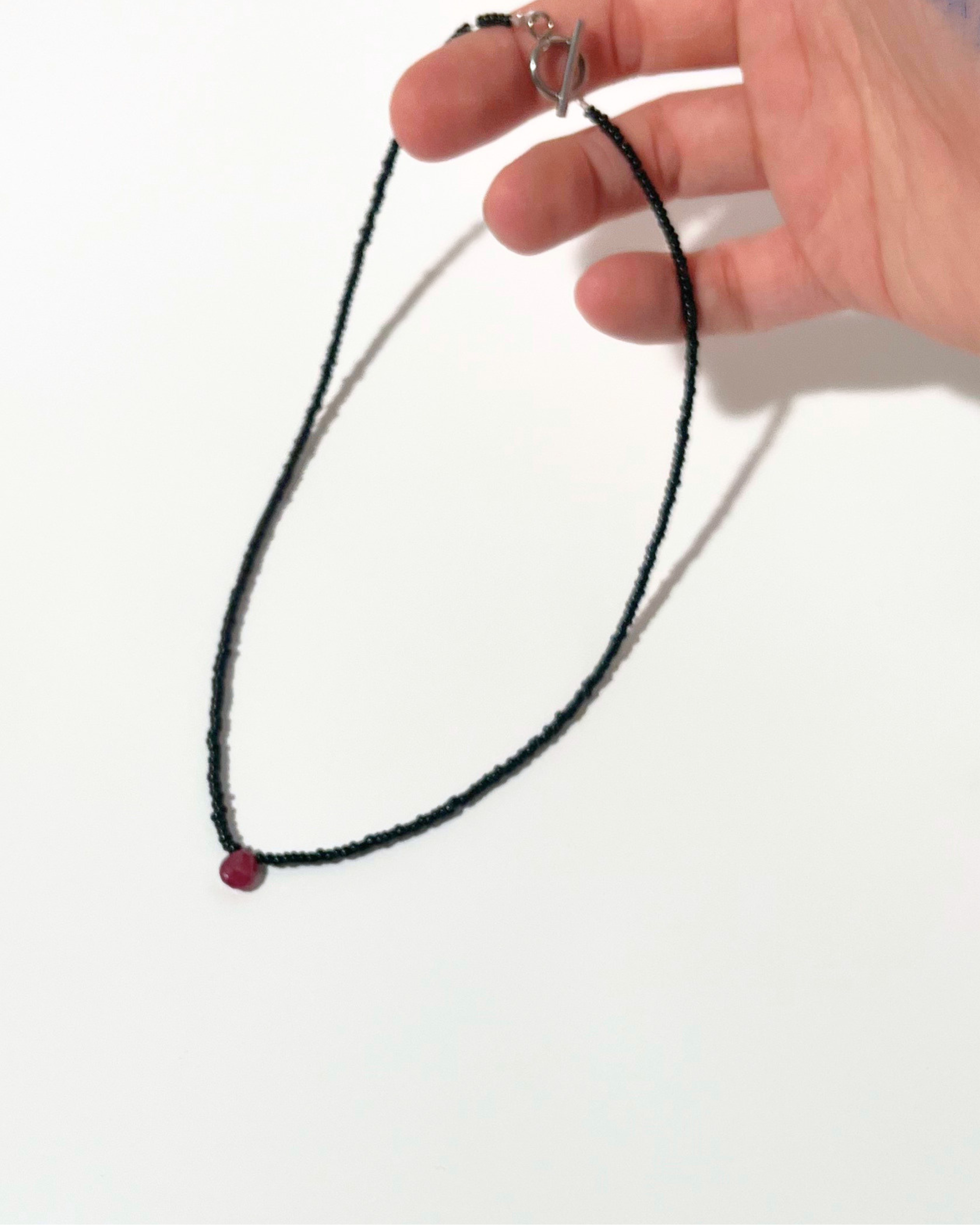 Handcrafted necklace with glass and one ruby briolette drop. Pictured necklace measures 16”. Made in Dayton, Ohio with loooooove :).