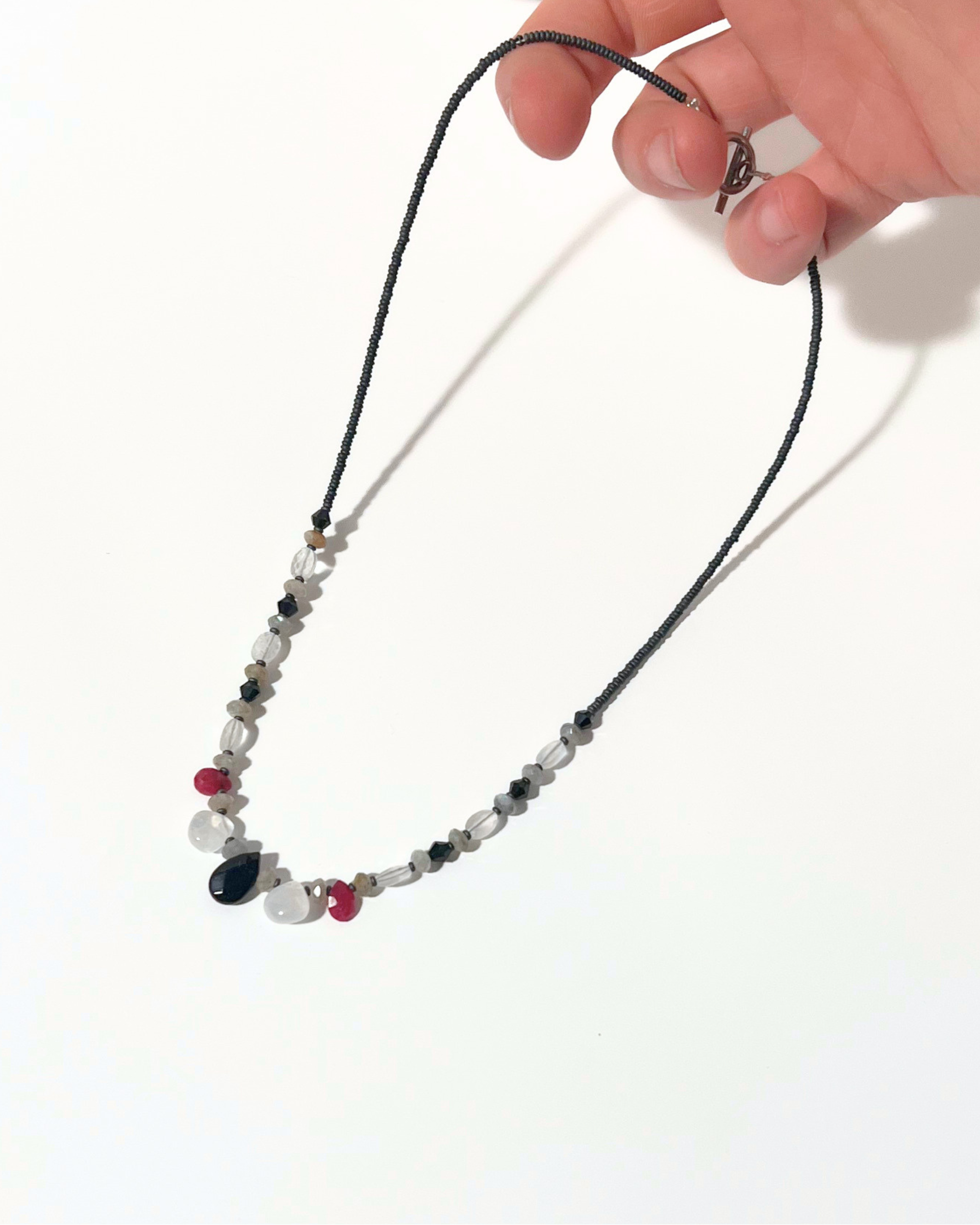 Handcrafted necklace with glass, ruby drop briolettes, moonstones, labradorite, and onyx. Pictured necklace measures 17”. Made in Dayton, Ohio with looooove :).