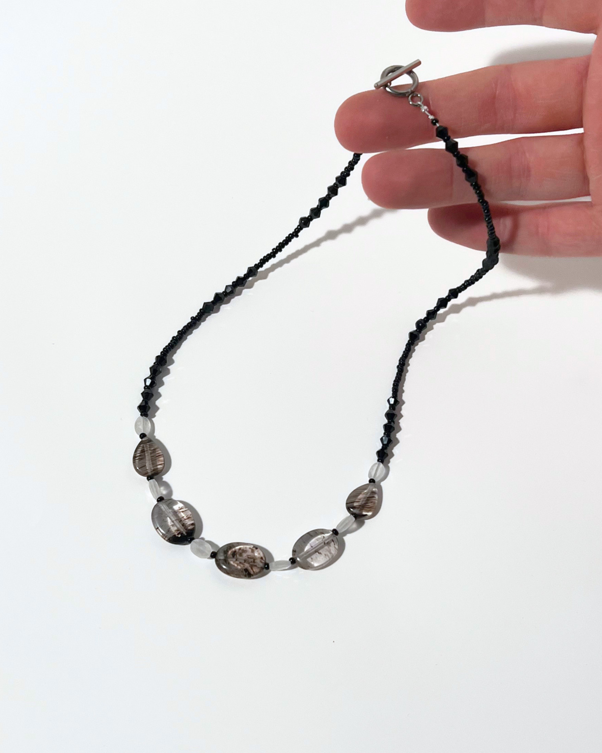 Handcrafted necklace with glass, moonstones, and black quartz. Pictured necklace measures 17”. Made in Dayton, Ohio with looooove :).